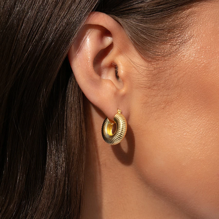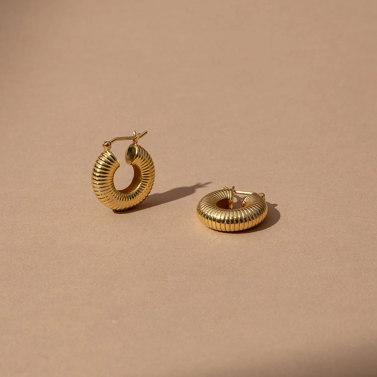 Add some texture to your ear stack with our Bold Vermeil Hoop Earrings. Crafted with 18k gold over sterling silver, these ribbed hoop earrings are just the thing you need to make a statement. For a full Vermeil ear stack, pair these statement earrings with our Diamond Pavé Vermeil Huggies.