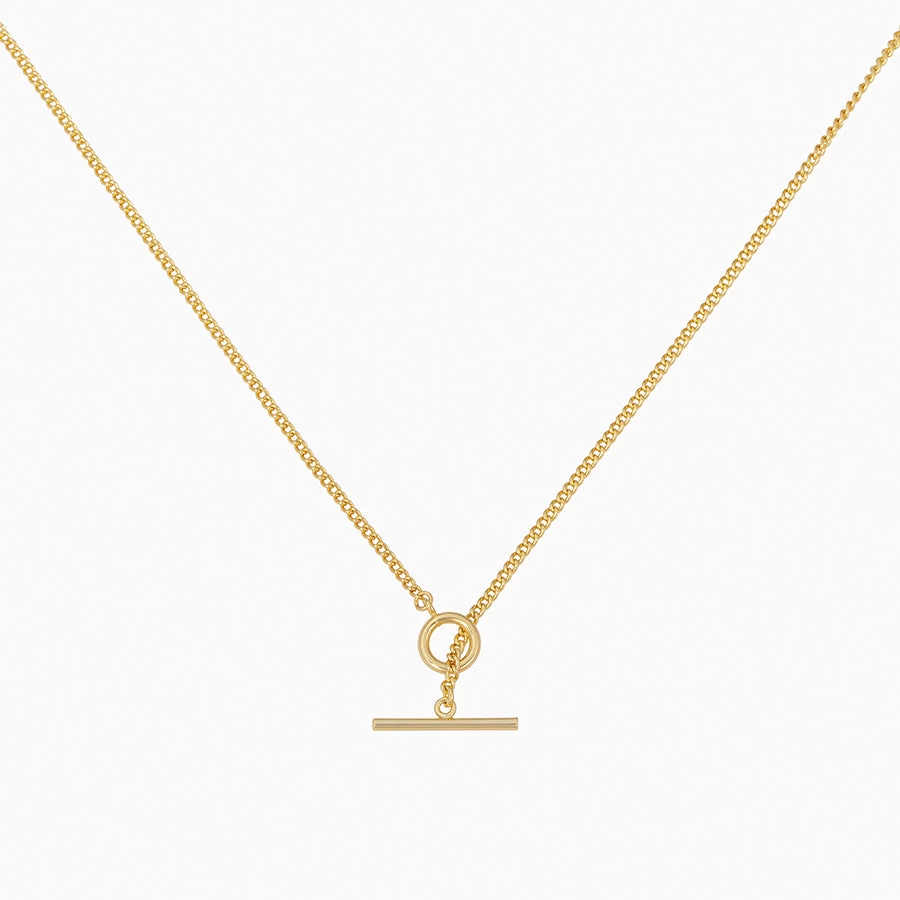 We took a simple chain and gave it some intrigue. Our Captivate Necklace features a large T bar closure front and center—in both 14k gold or rhodium plating.