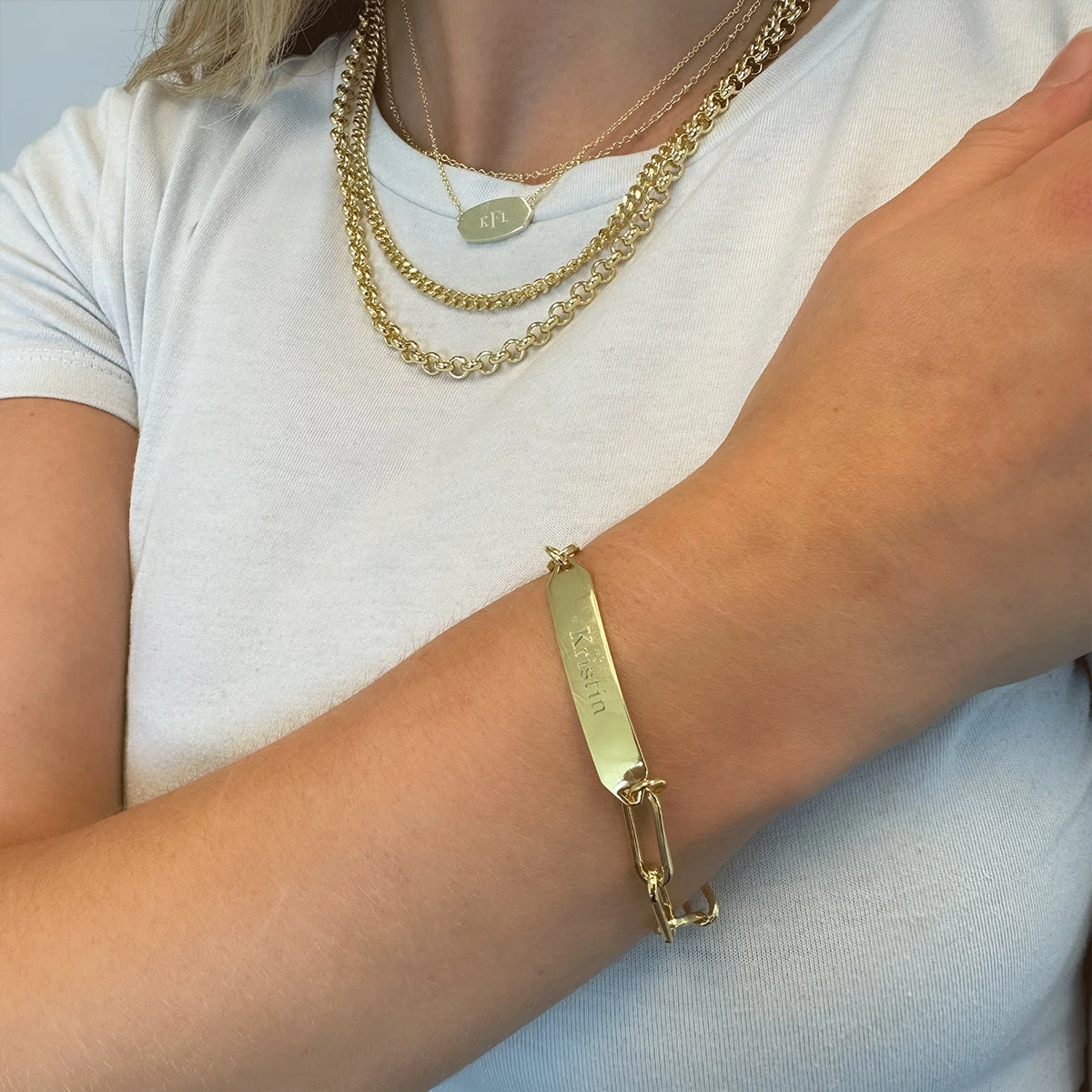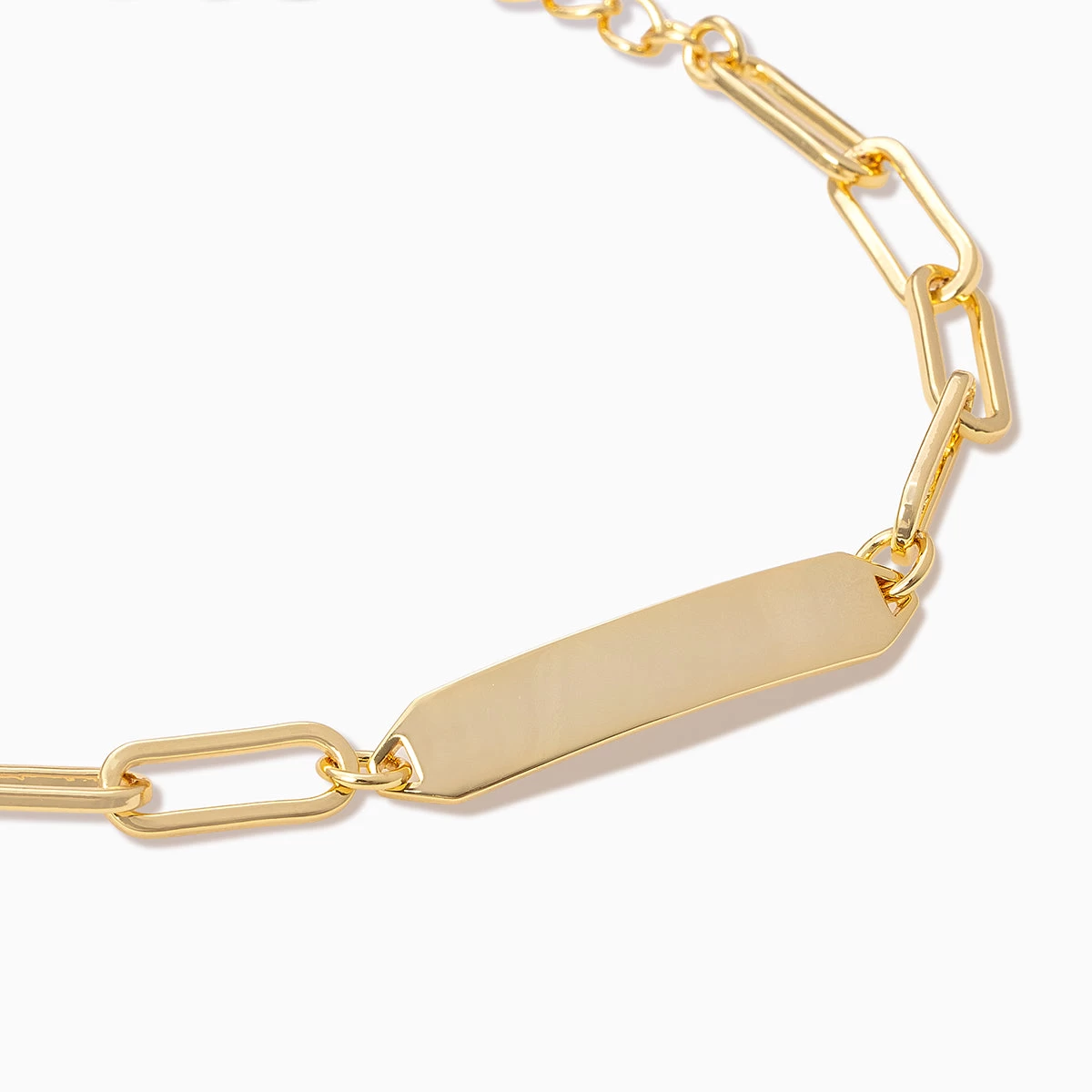 Make a personalized statement with our engravable Chain and Bar Bracelet. Crafted with a paperclip chain and a smooth bar pendant, this gold bracelet can be engraved with up to 16 characters if you choose a smaller font size. If you choose a larger font size, you can engrave up to six characters.