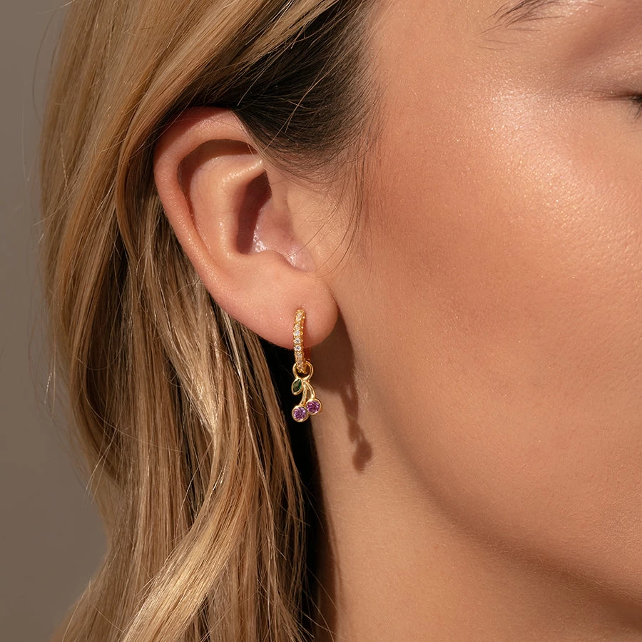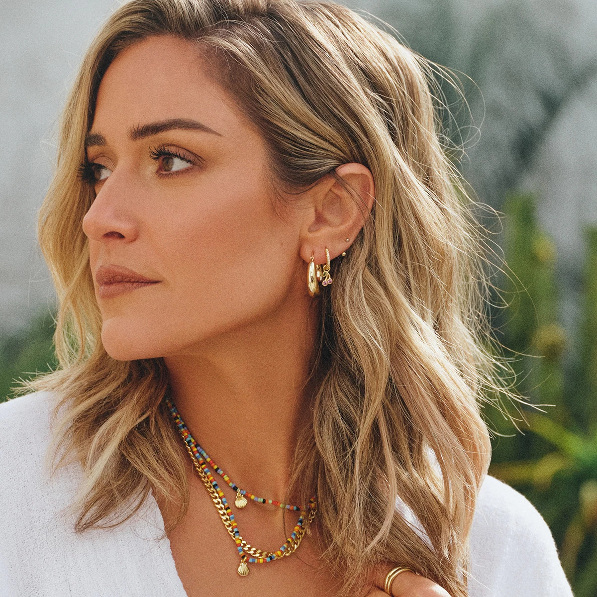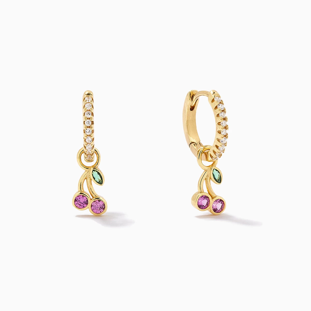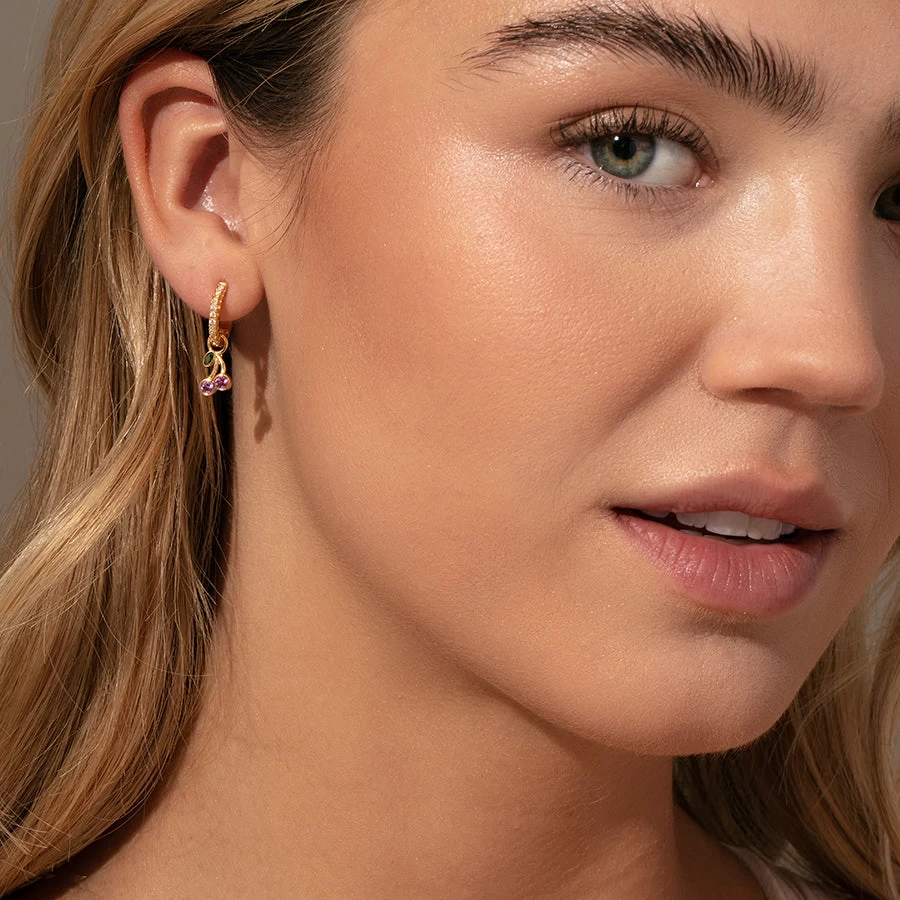 Your earring stack needs something fresh and fun like our Cherry Huggies. Crafted from a gold pavé hoop and a colorful cherry charm, these are a summer stacking essential. Recreate Kristin’s look by pairing these small hoops with our Rare Hoop Earrings and Two Way Street Ear Jacket.