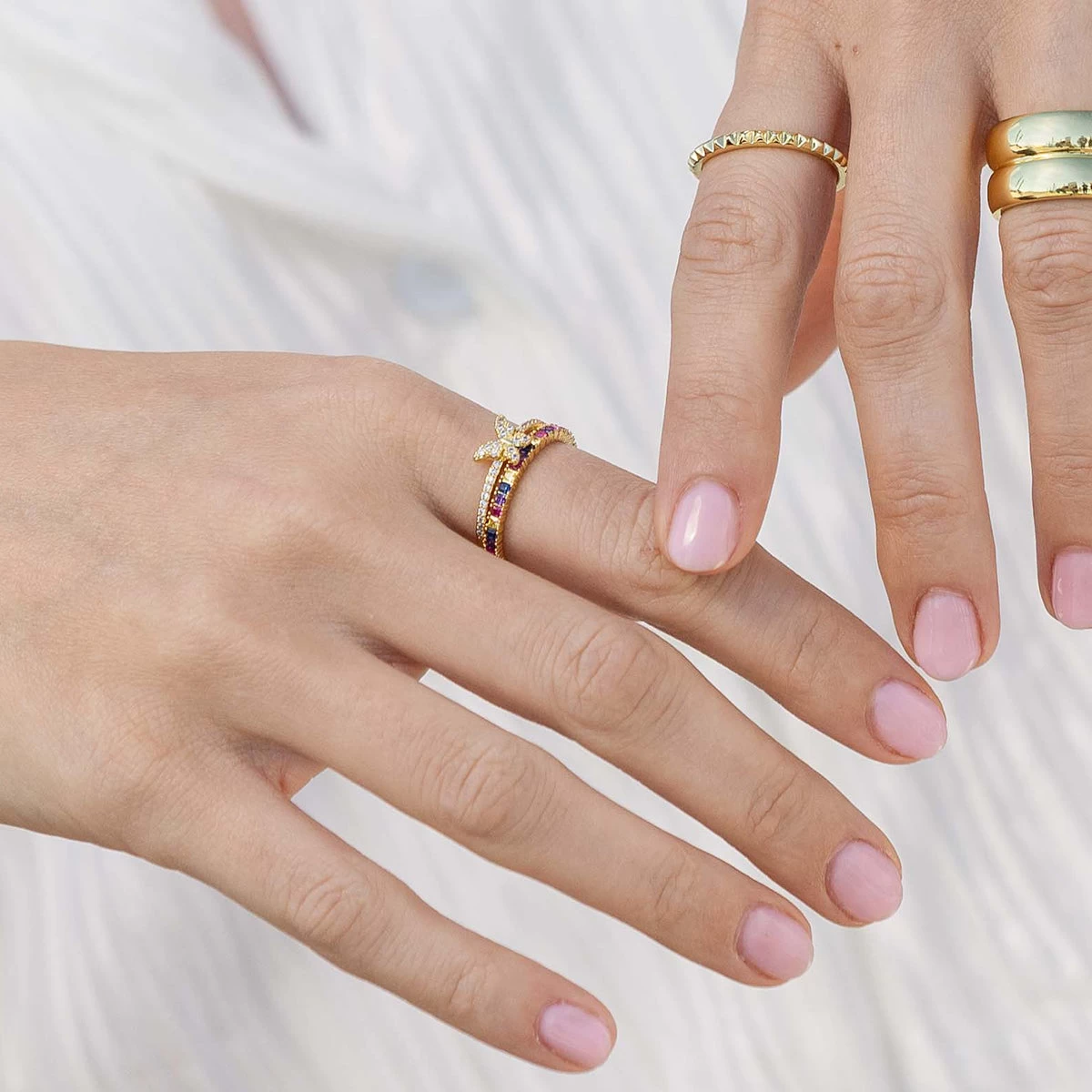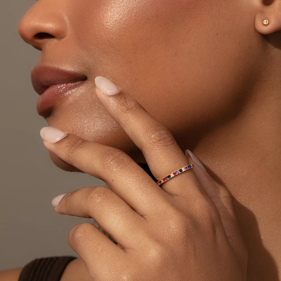 Add a pop of color to your look with our patterned Colorful Baguette Ring. Want even more gold in your look? Stack this ring with our Textured Stud Ring for an untouchable combo.