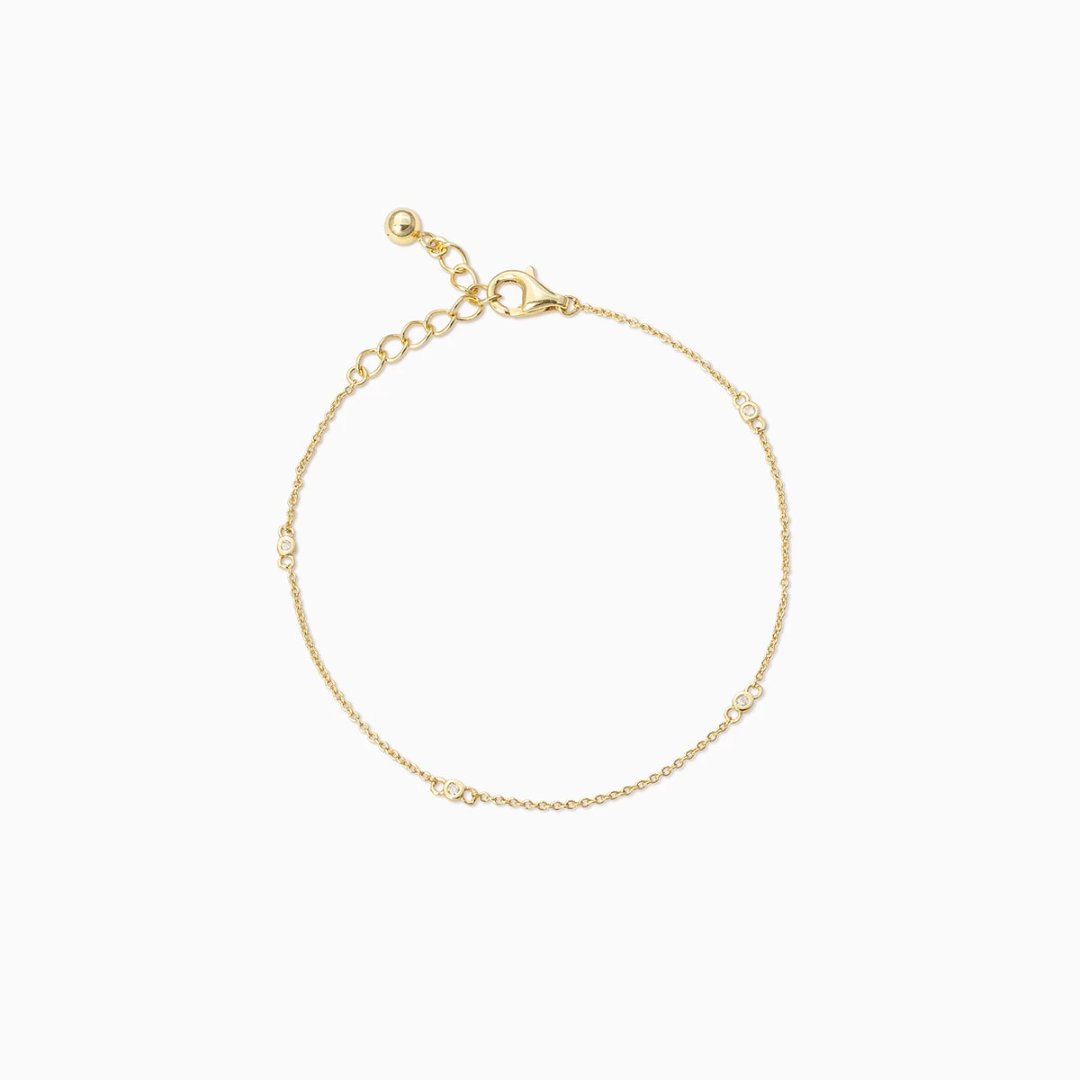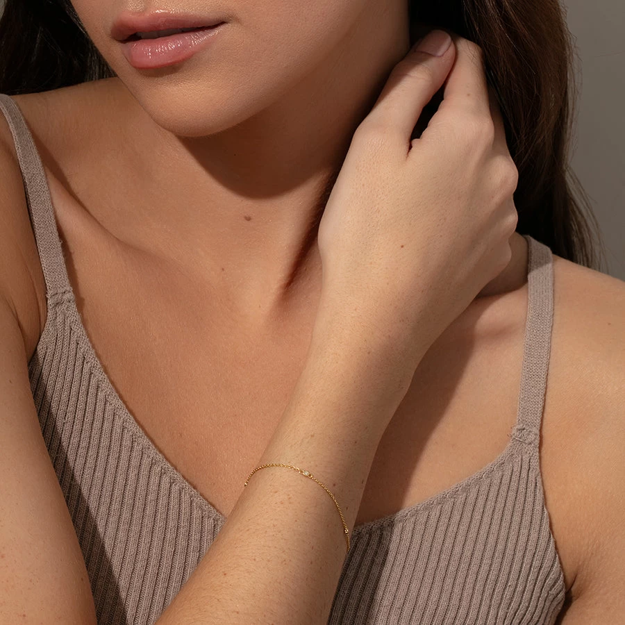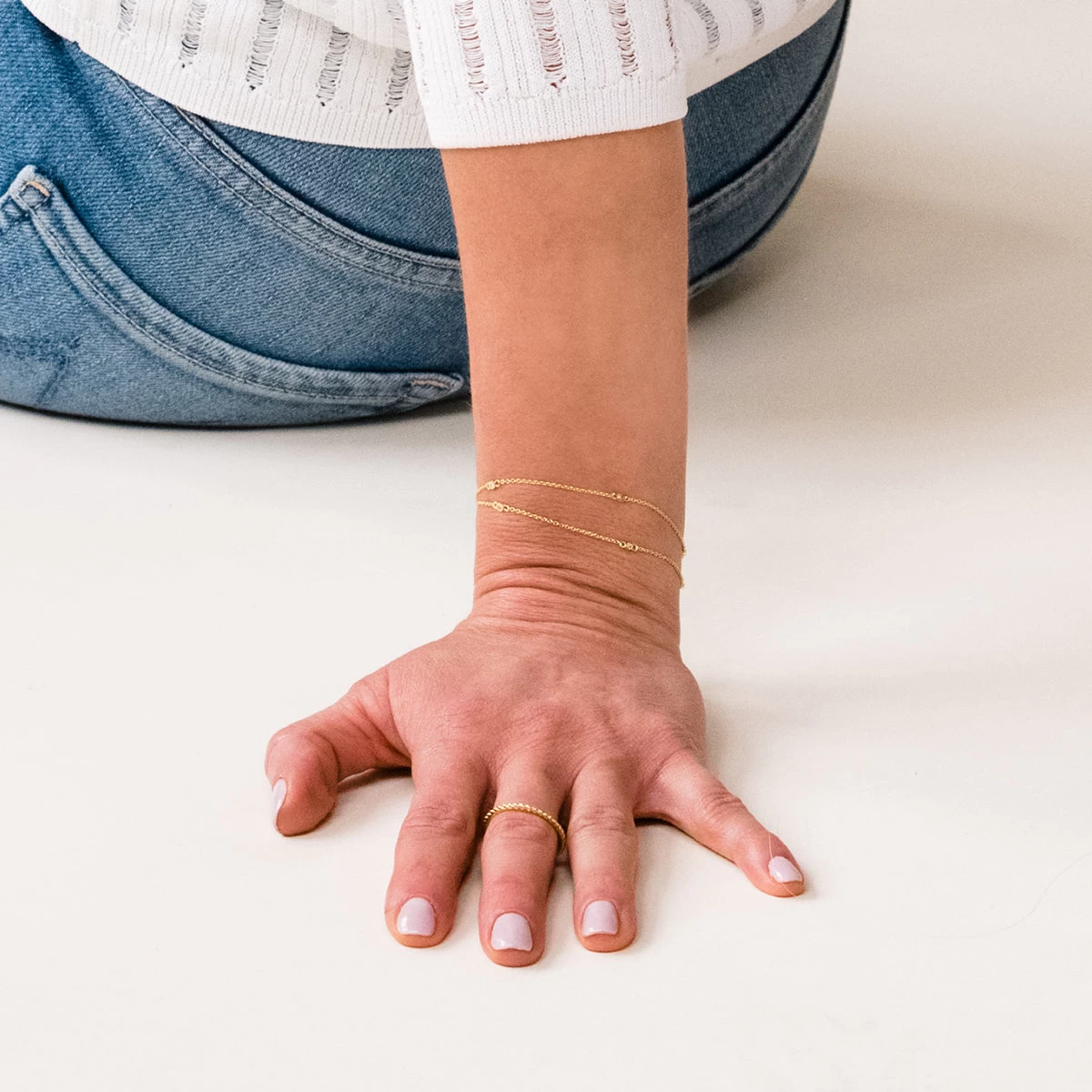 Keep things dainty and simple with our Dainty Diamond Vermeil Bracelet. Crafted with 18k gold over sterling silver and four real, slightly included round-cut diamonds, this gold bracelet is perfect for everyday wear. To recreate Kristin’s look, pair this dainty chain bracelet with our Simple Life Vermeil Ring.