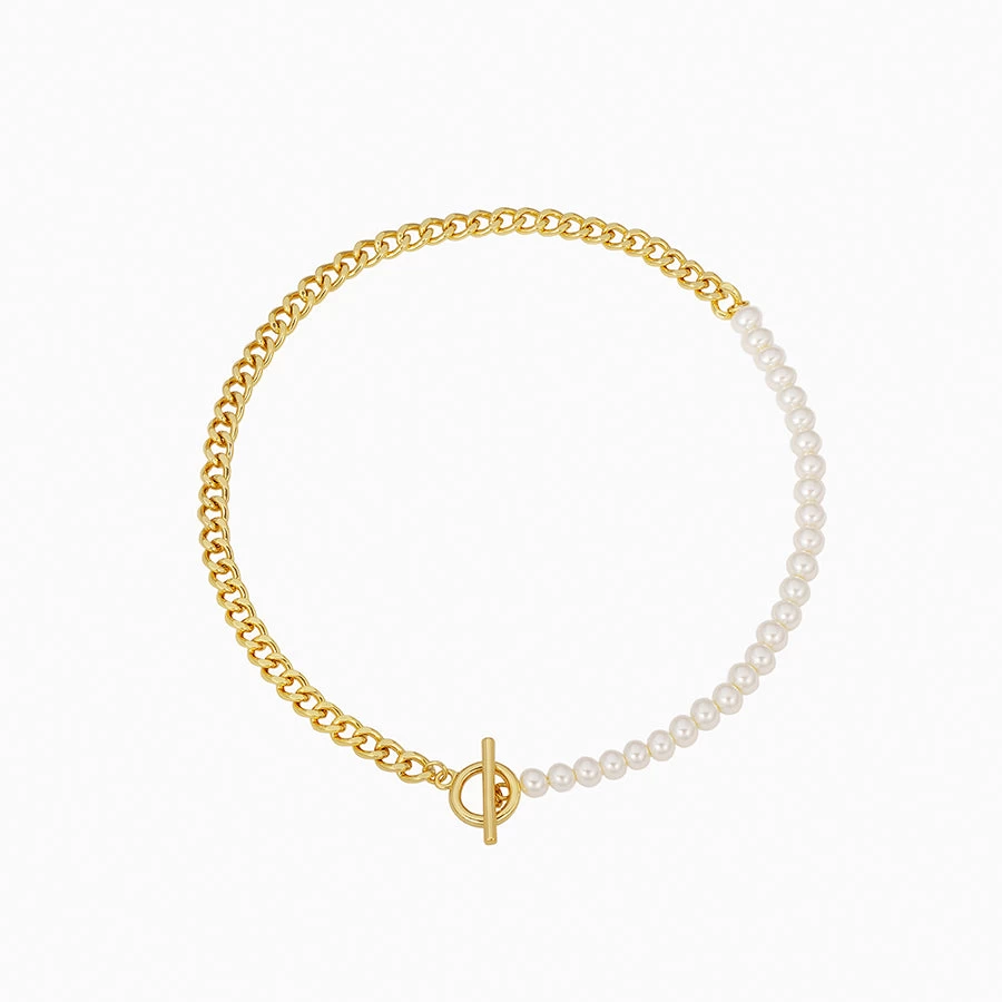 Should you go timeless or trendy? Why choose when our Double Standard Necklace does both. Half gold-plated curb chain, half faux pearls, with a statement t-bar closure, this gold and pearl necklace is a must-have. For a complete look, pair it with gold and pearl earrings.