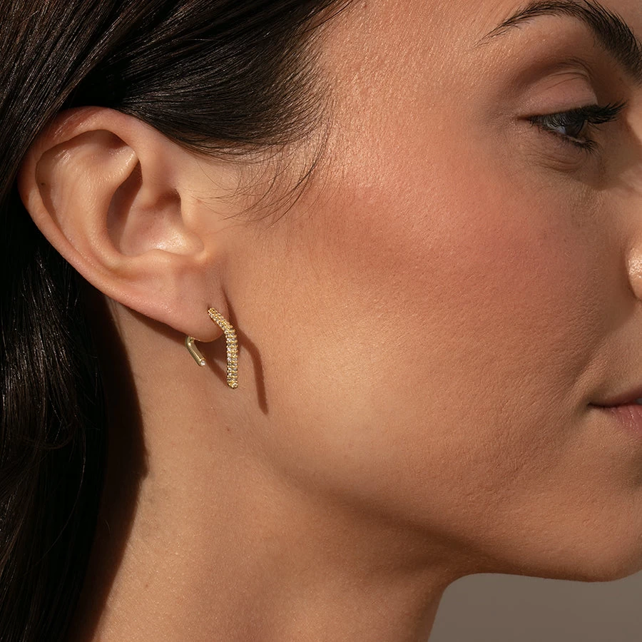 You’ve never met an earring quite like our Ego Ear Jacket. Featuring a pavé design in the front and a solid gold back detail, these unique earrings are the everyday statement piece you need. To recreate Kristin’s ear stack, pair these gold earrings with our Star Power Huggies and simple stud earrings.