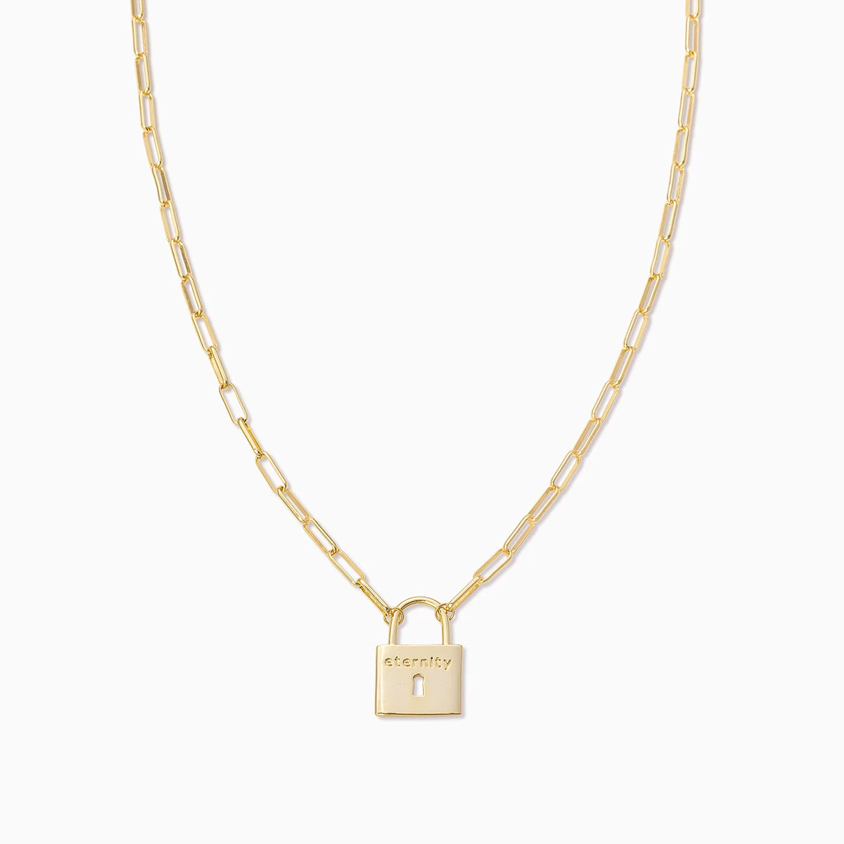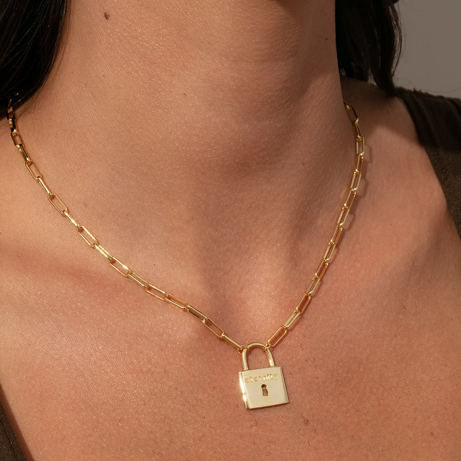 Lock down your everyday look with our Eternity Lock Necklace. This gold necklace is crafted from a lock pendant that reads “eternity” and a paperclip chain necklace. To make Kristin’s necklace stack yours, pair this chain and pendant necklace with our Horizon Necklace and Ready to Mingle 2.0 Necklace.