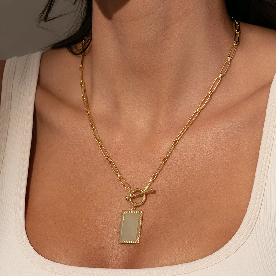 Crafted with a paperclip chain, a toggle closure, and a bold rectangle pendant, our Glorious Pendant Necklace is the statement necklace everyone needs. We almost left out the best part about this chain and pendant necklace — you can get it engraved! Personalize this engravable necklace by adding one character.