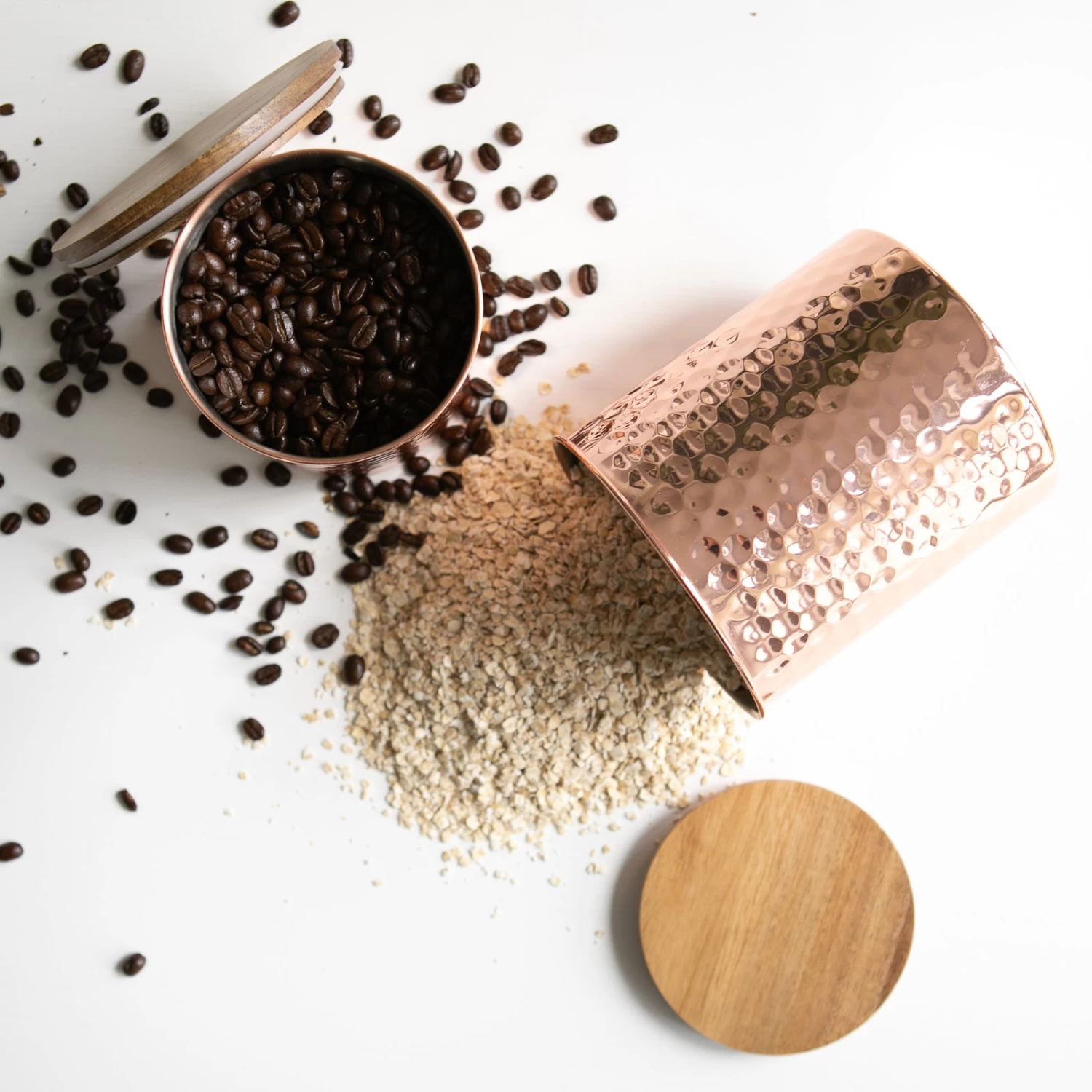 Take your kitchen to the next level with these hammered copper canisters, perfect to store your morning coffee, sugar, or ingredients for that Sunday afternoon baking sesh. This set of 2 comes with one medium and one large canister, both with smooth wooden lids to add a rustic touch to any chic space.