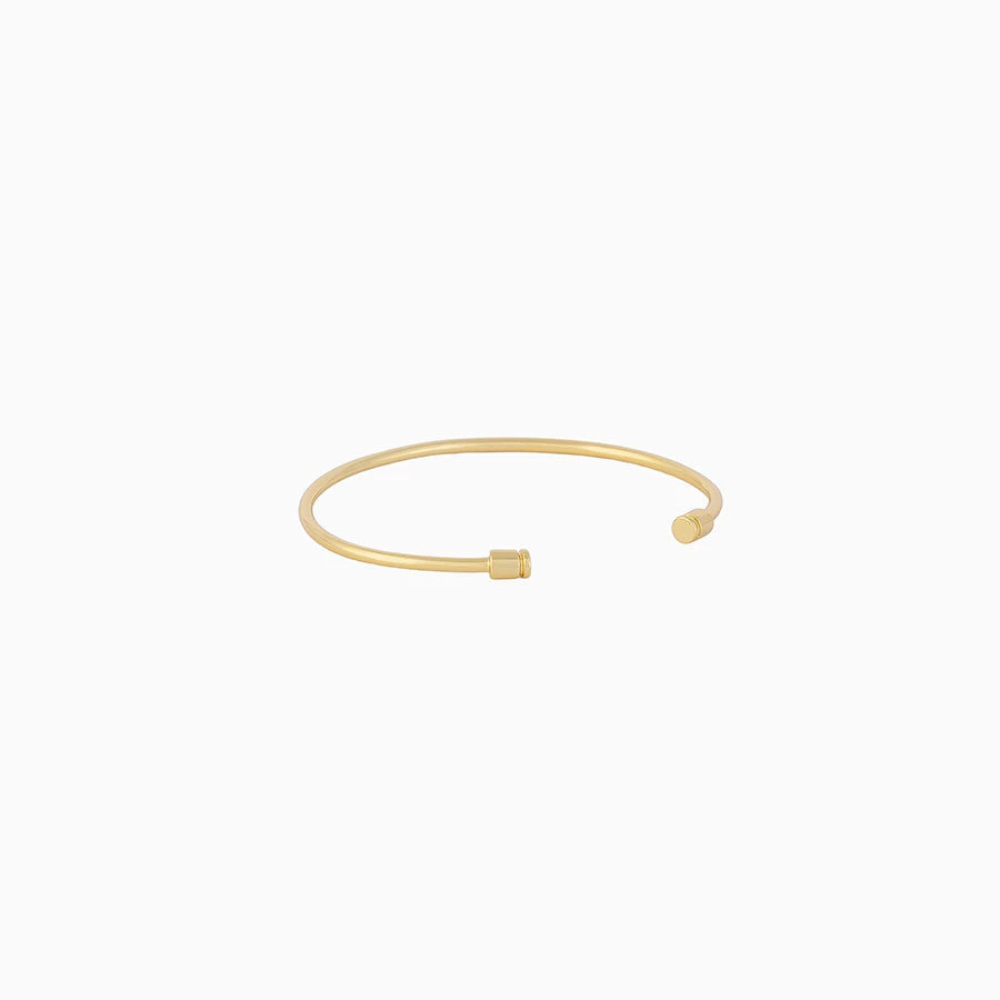 Build your collection of classics with our Off the Cuff Bracelet. Capped with circles and cylinders, this timeless cuff bracelet is perfect for your everyday style. It stacks well with other cuffs, chunky chains… the combinations are endless with this piece that comes in both 14k gold plating and rhodium plating.