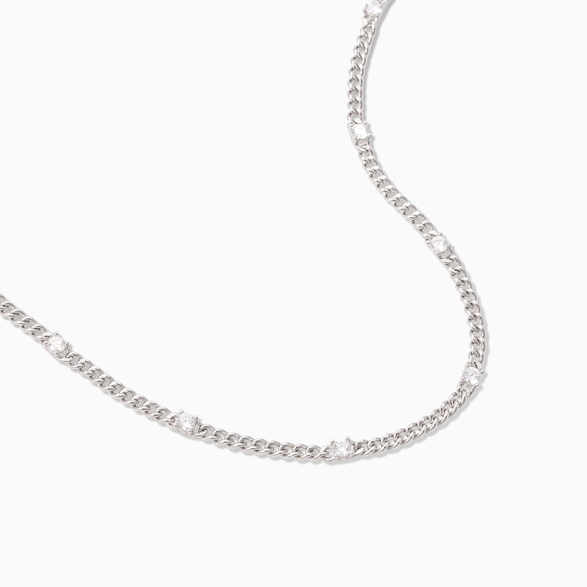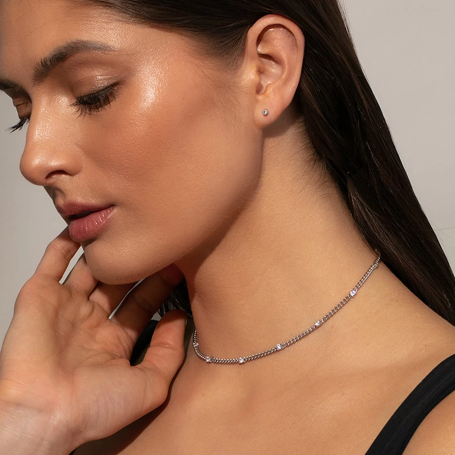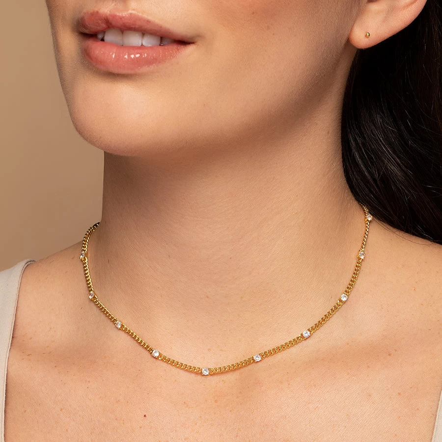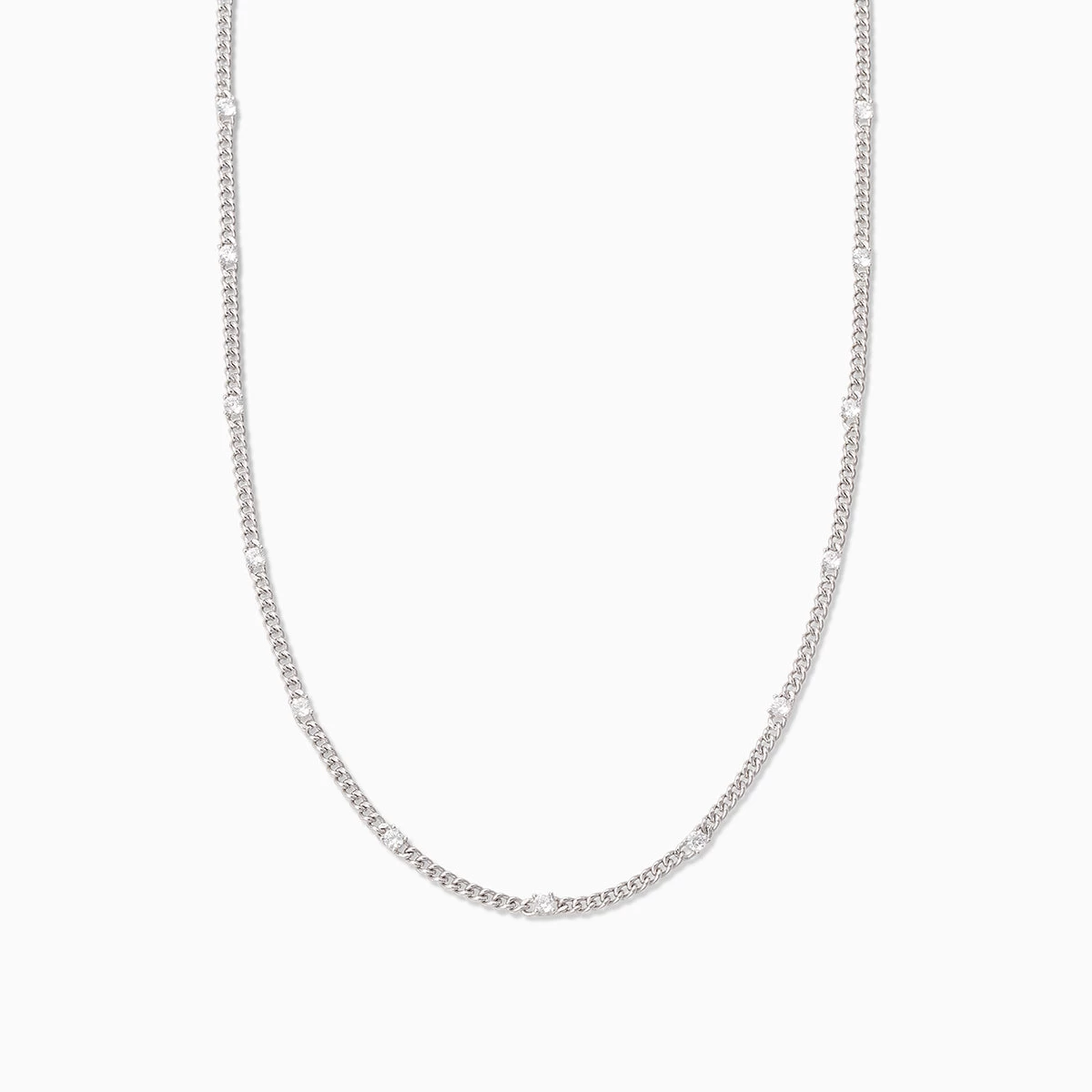 Our Pattern Necklace is here to step up your chain game with some shine. Featuring a Sterling Silver or gold curb chain and bold stones, this chain necklace is sure to put all eyes on you. For a look our stylists love, pair this necklace with a bold heart necklace.