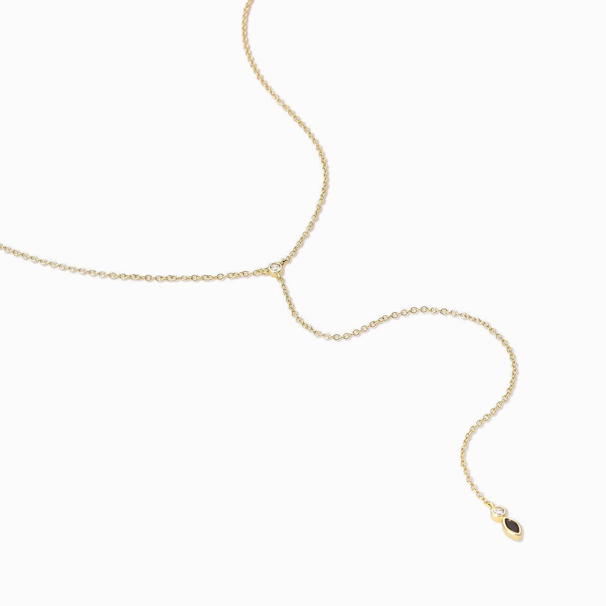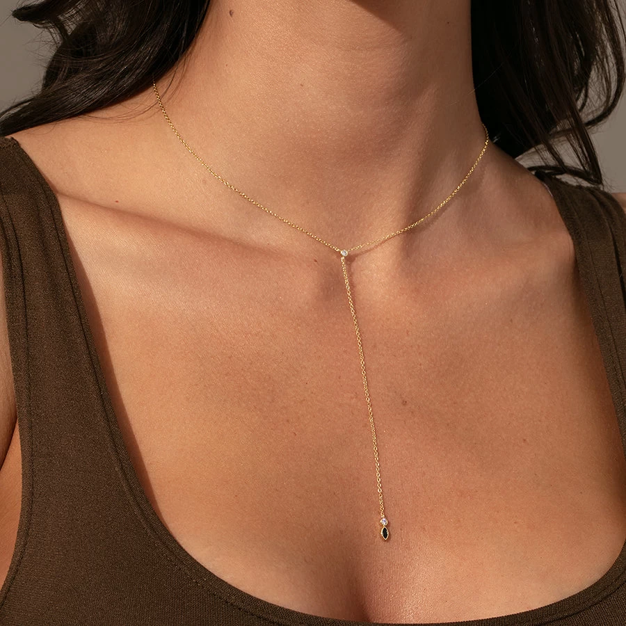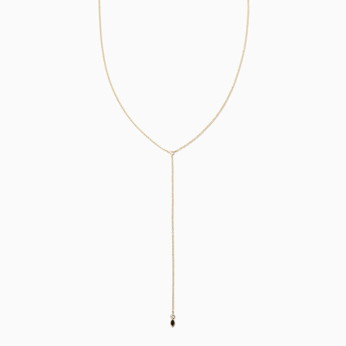 The Rebellion Lariat Necklace is going to be your new favorite. This dainty chain necklace features a front-and-center cubic zirconia stone and a black stone for an added touch of glam. To style this gold necklace like the lariat-obsessed-queen Kristin, layer it with our Rose Pendant Necklace. Want even more lariat necklaces? Shop our full collection.