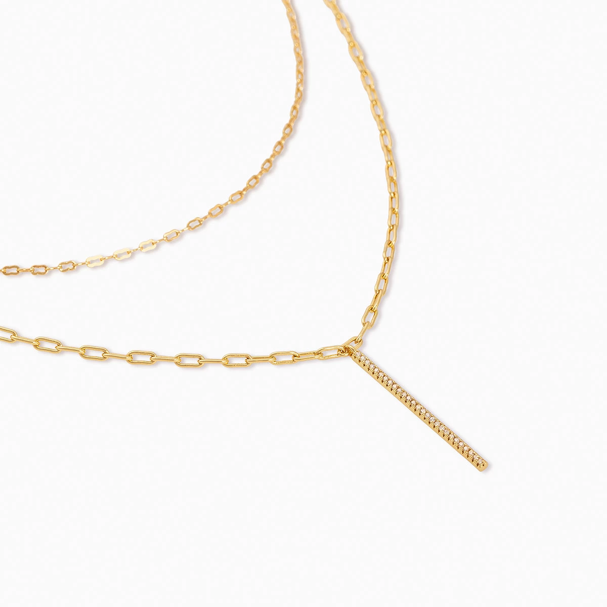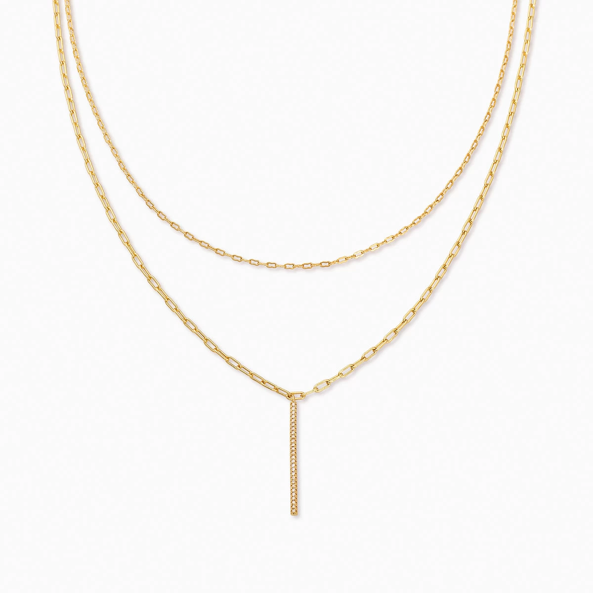 We did the layering for you in our Simple Double Chain. Two layers of classic gold chains and a gold bar with pavé detail are all you need for any look.