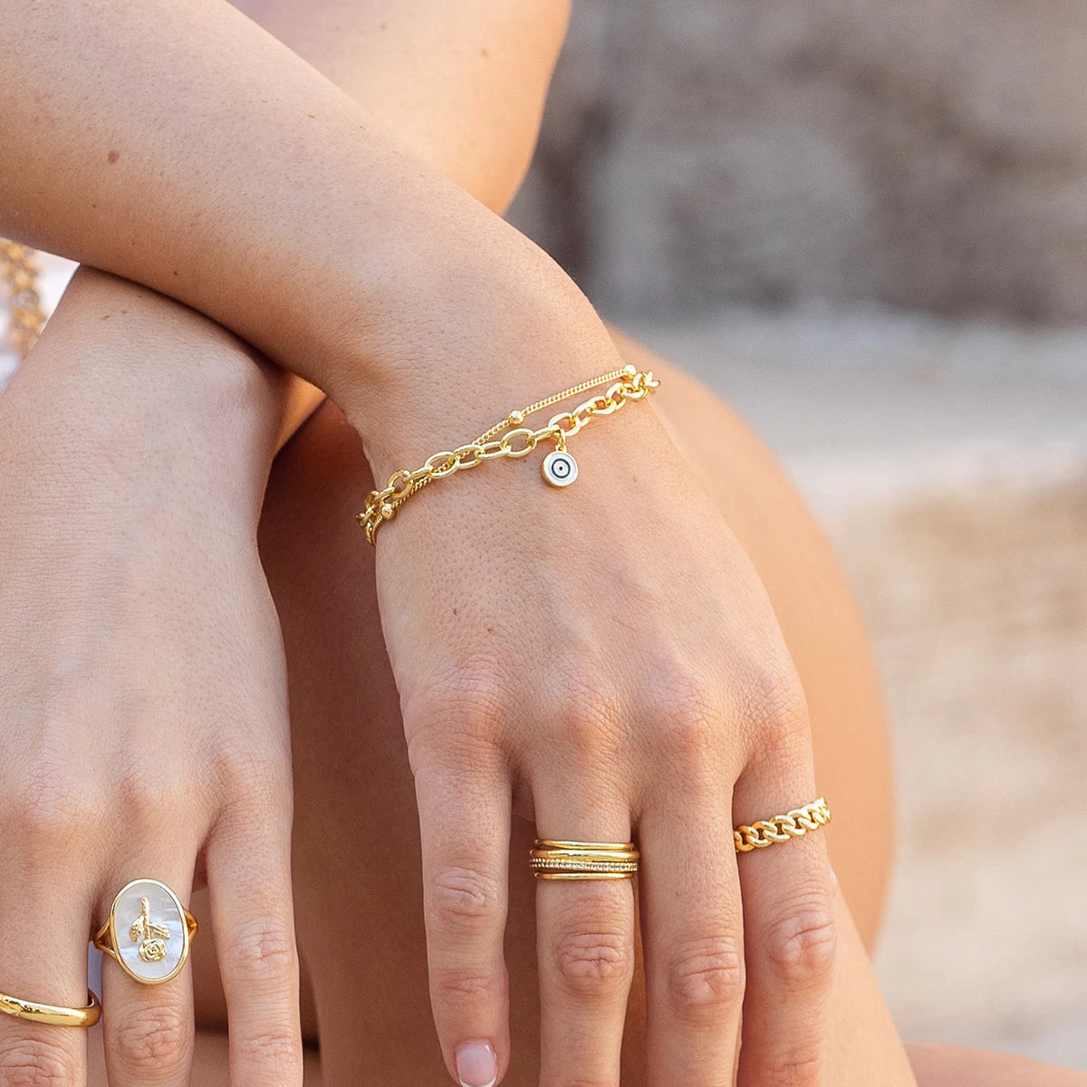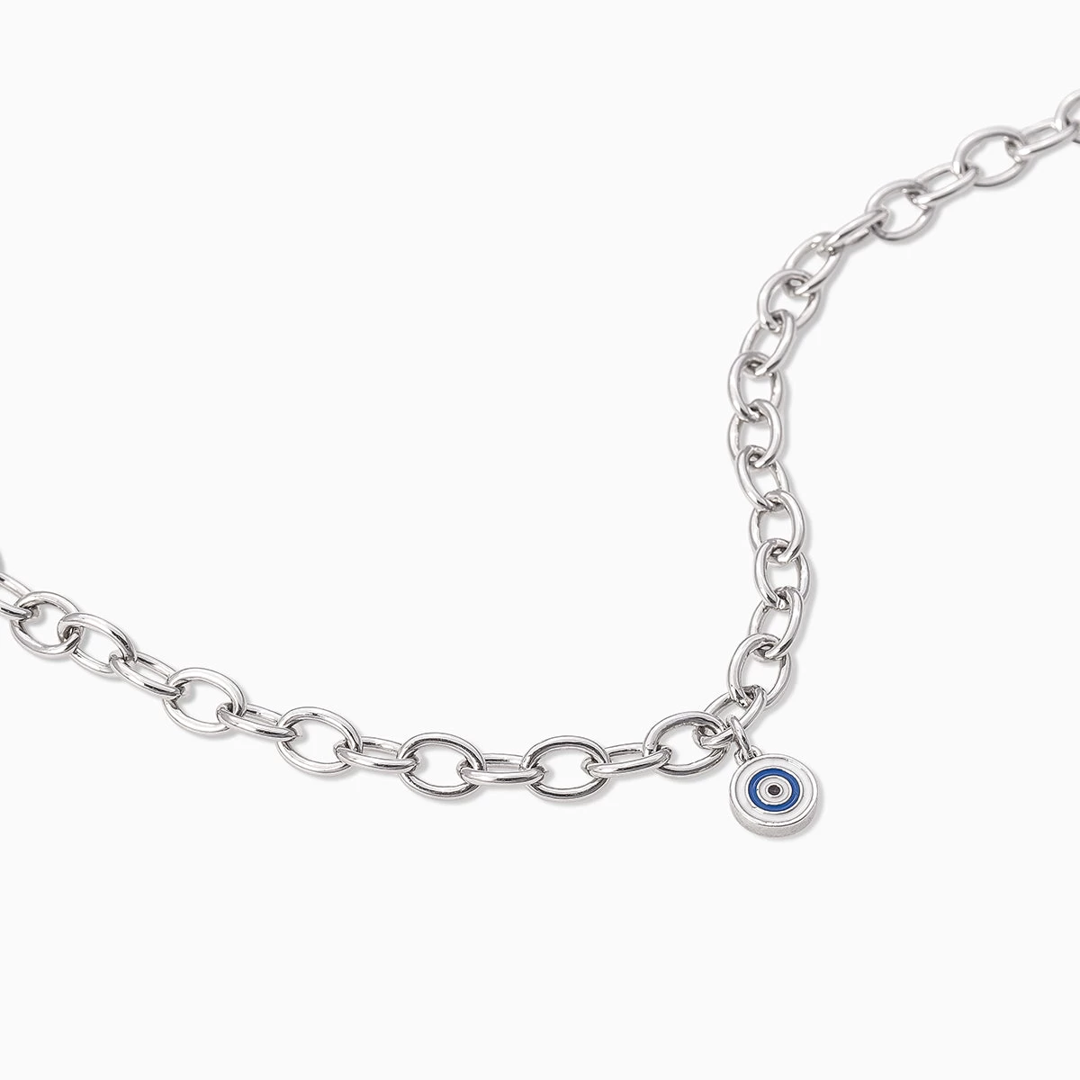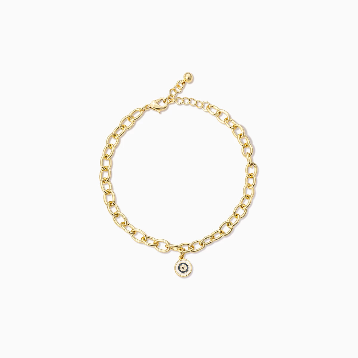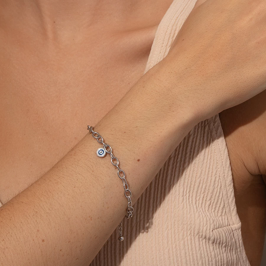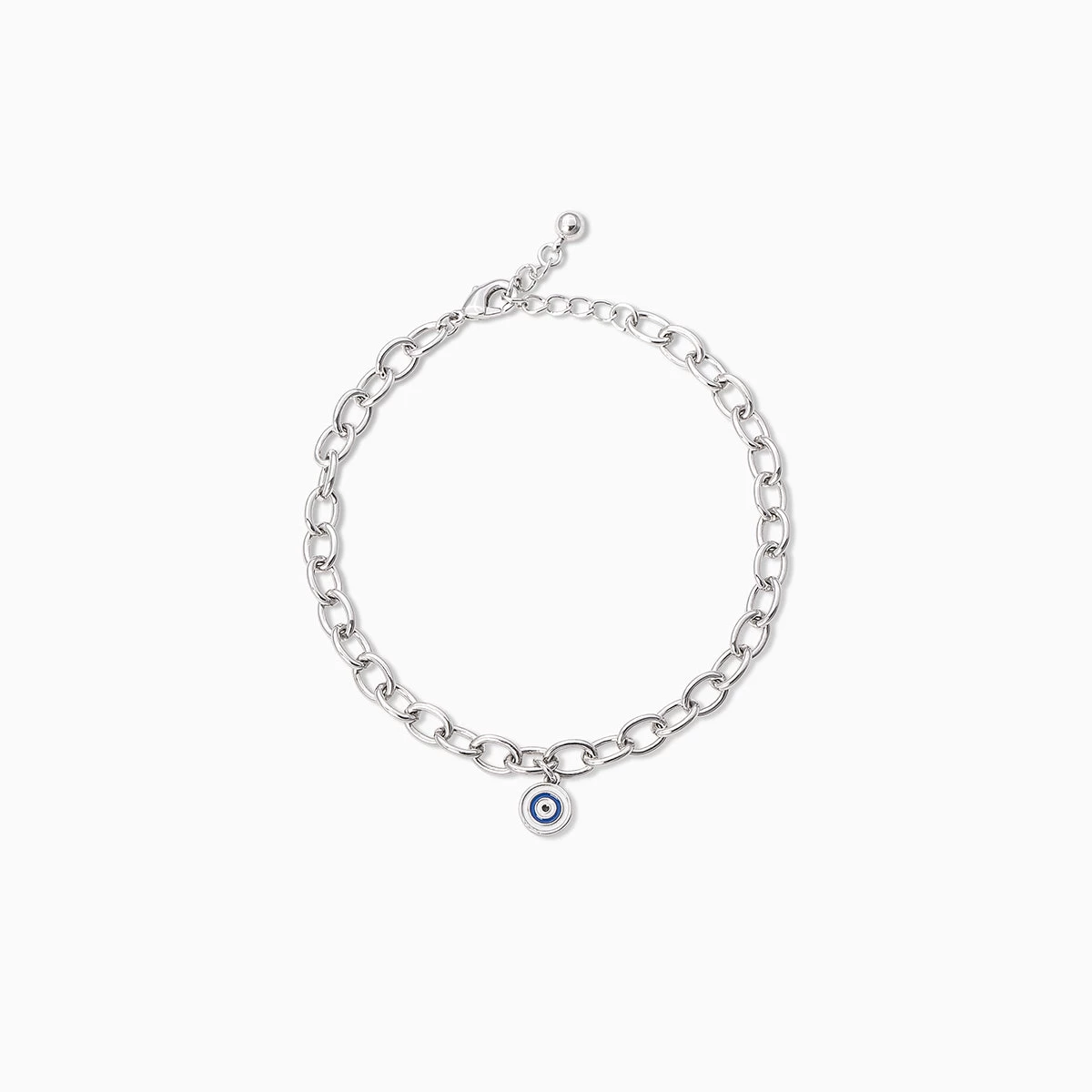 Take your simple chain bracelet look to a whole new level with our Simple Evil Eye Bracelet. Coming in silver and gold, this chain bracelet with an evil eye pendant will easily become an everyday staple. Want even more statement bracelets to pair with this evil eye pendant bracelet? Check out our collection of pendant necklaces + bracelets.Â