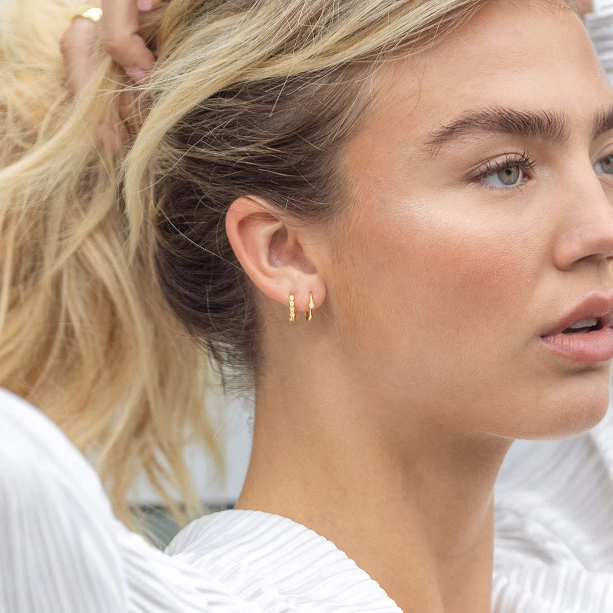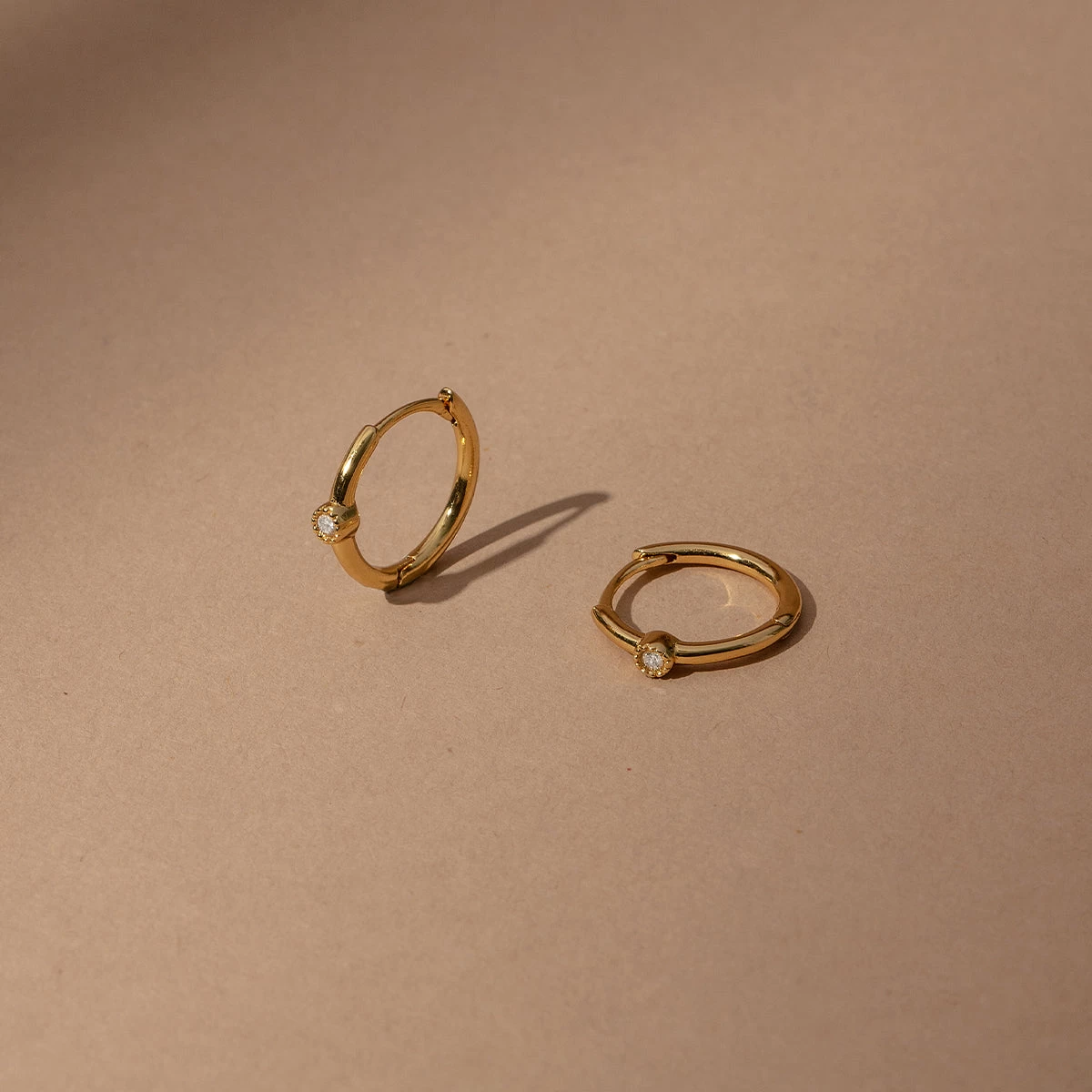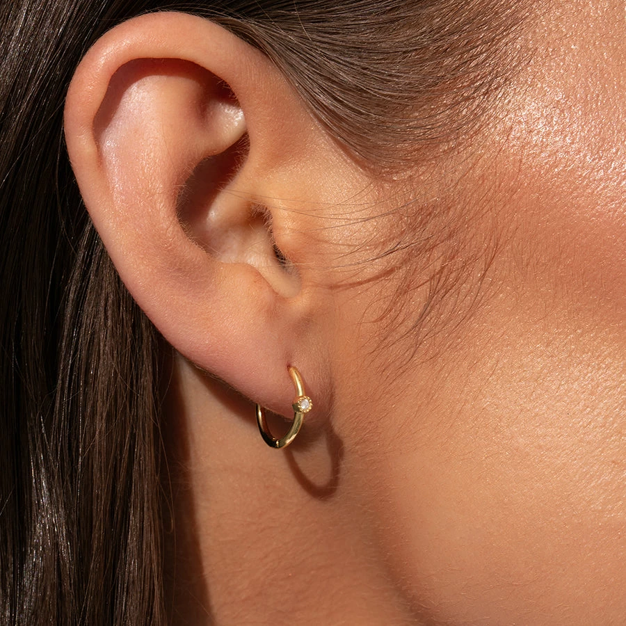 Add a glimmer of sparkle to your ear stack with our Solo Diamond Vermeil Huggies. Crafted with 18k gold over sterling silver, these huggie earrings feature a real, slightly included round-cut diamond that’s sure to get attention. For a full ear stack, layer these mini gold hoops with our Diamond Pavé Vermeil Huggies.
