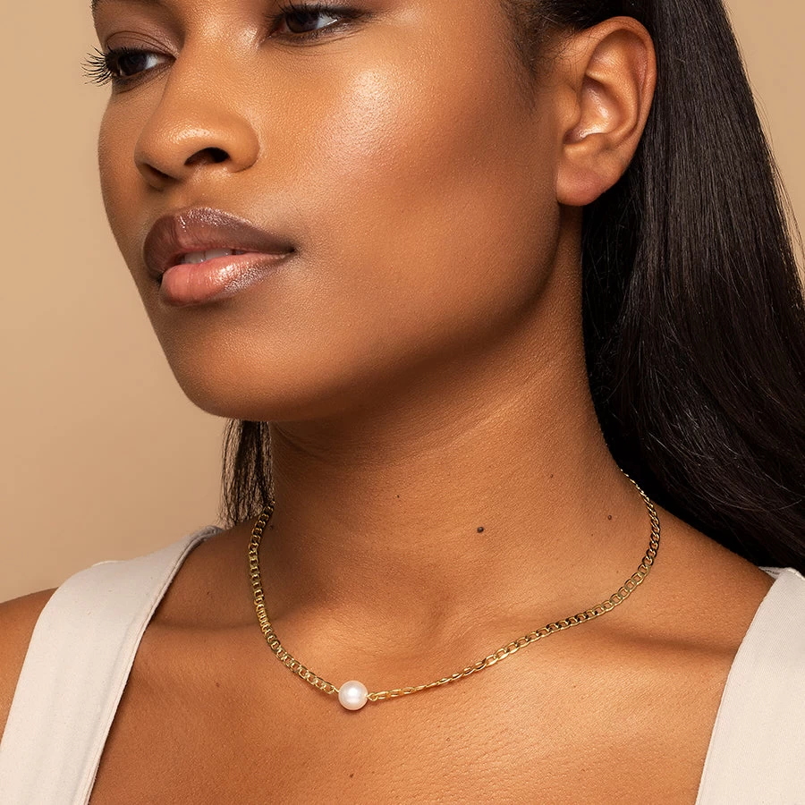 Be bold and timeless with our Statement Pearl Necklace. A unique curb chain necklace houses a statement pearl for both modern and classic vibes. To recreate Kristin’s white and gold necklace look, pair this single pearl necklace with our Enamel Heart Necklace. Want more pearl jewelry? Shop all of our pearl styles now.