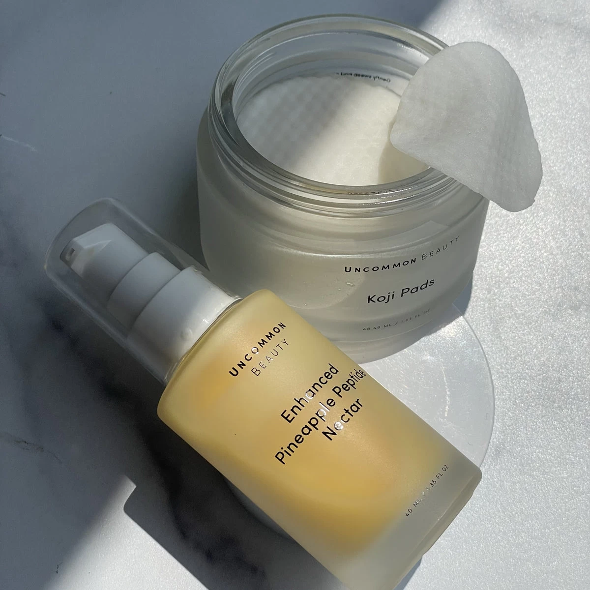 Dull skin is a thing of the past thanks to our Super Glow Duo. Featuring our Koji Pads and Enhanced Pineapple Peptide Nectar, this skincare duo works to brighten, hydrate, evenly tone, restore a youthful glow, reduce the appearance of blemishes, reduce the appearance of wrinkles, and more. After cleansing, swipe one Koji Pad across your clean, dry face and neck. Follow with our Enhanced Pineapple Peptide Nectar for a luminous glow.