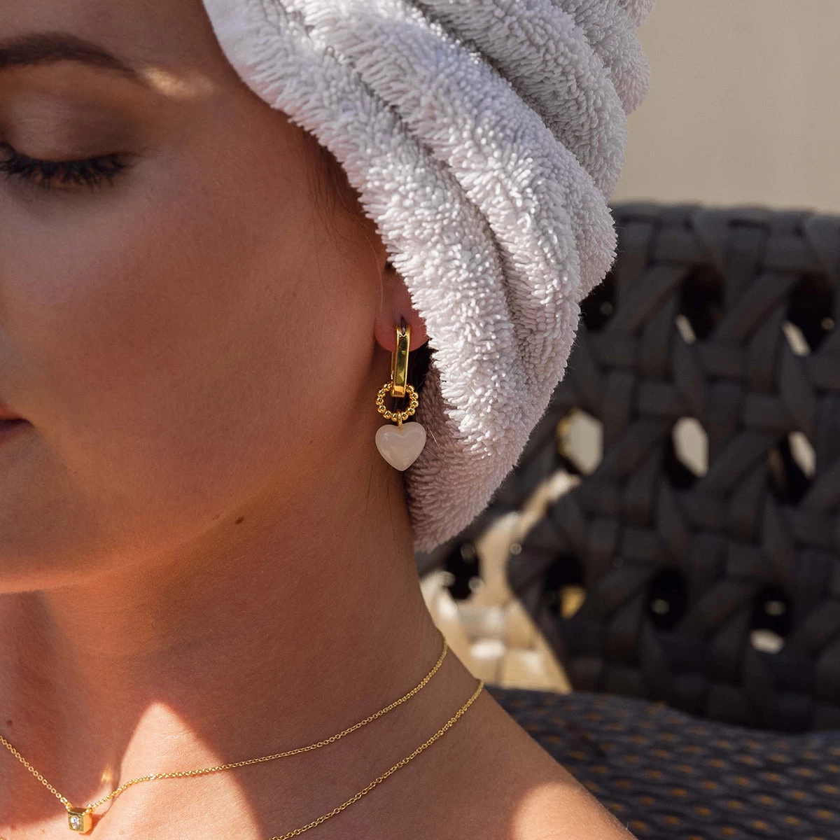 Want a bold white heart earring? Our Sweetheart Earrings are just the thing you need. Featuring a rectangle hoop, gold hoop, and white heart dangle, these earrings are sure to leave everyone in love with you. To really let these shine, try stacking them with our Forever Stud Earrings.