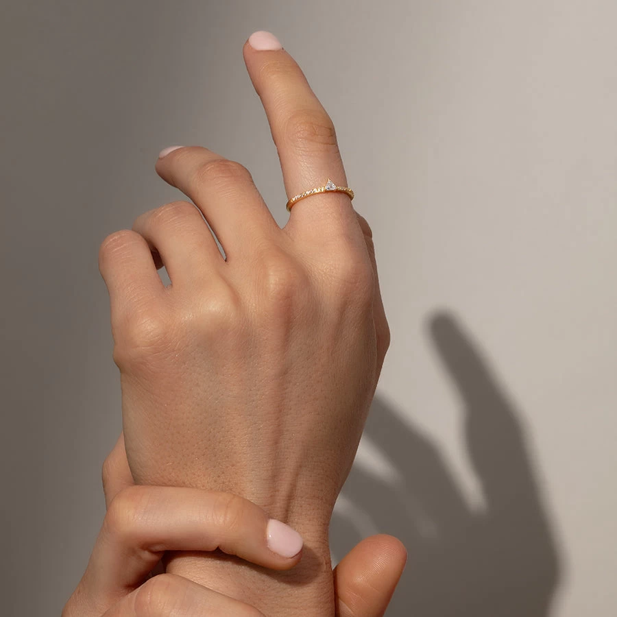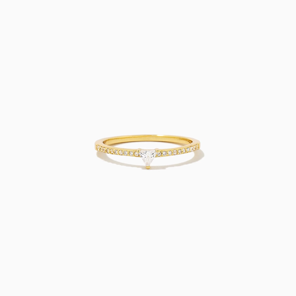 Everyone needs a simple ring that makes their stack shine. Cue the Three Points Ring. Crafted with a simple gold half pavé band and a center triangle stone, this everyday ring is a stacking staple. For a full look, pair this gold ring with our Whole Heart Ring.