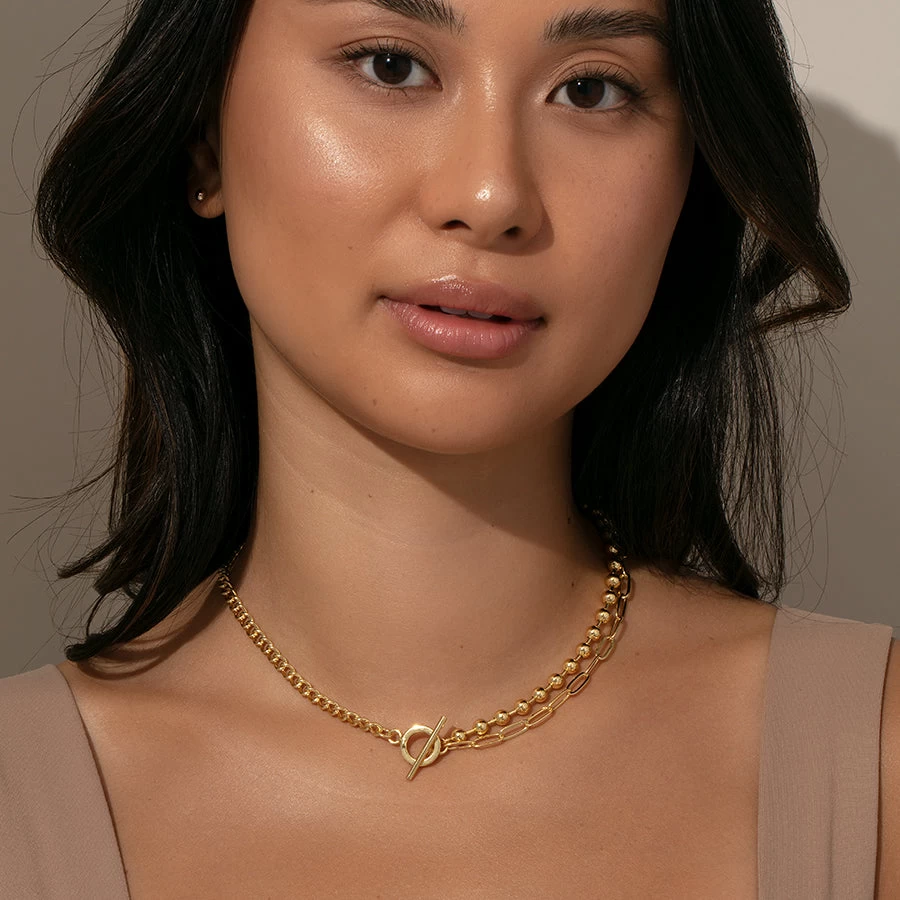 Our Three’s a Party Chain Necklace deserves to be celebrated for the way it effortlessly combines a paperclip chain, a cable chain, and a ball chain into one piece. This gold chain necklace can be worn all on its own, or layered with as many necklaces as you want.