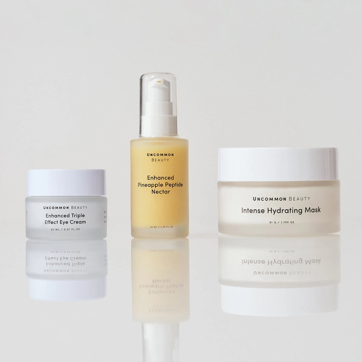 Our Triple Hydration Bundle is basically a glass of water for your face. Get an ultra-hydrated, moisturized look when you pair our Intense Hydrating Mask, Enhanced Pineapple Peptide Nectar, and Enhanced Triple Effect Eye Cream together.