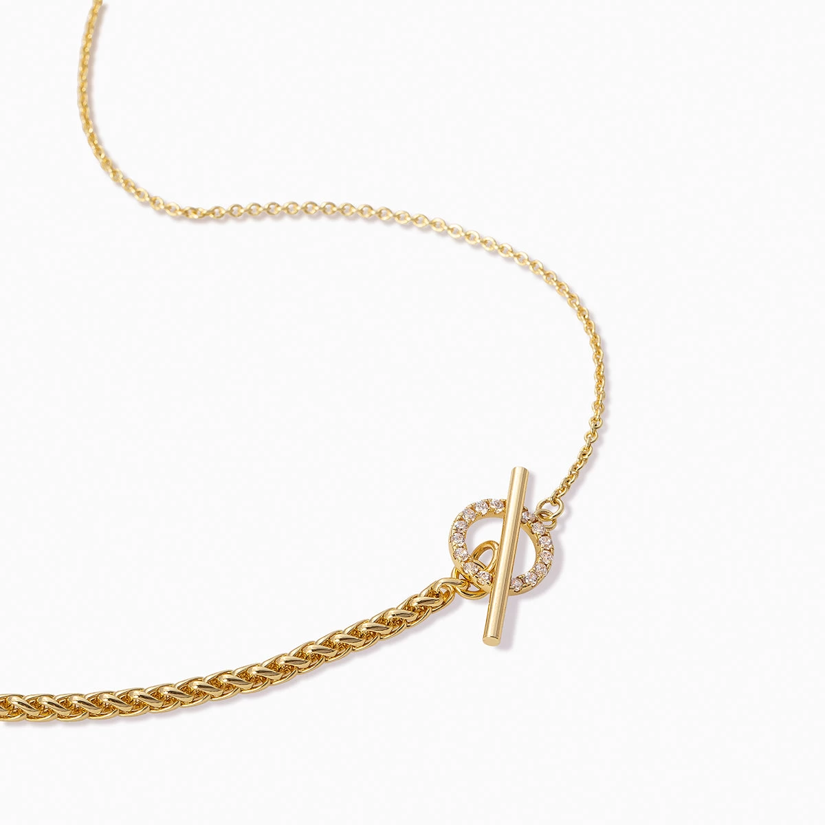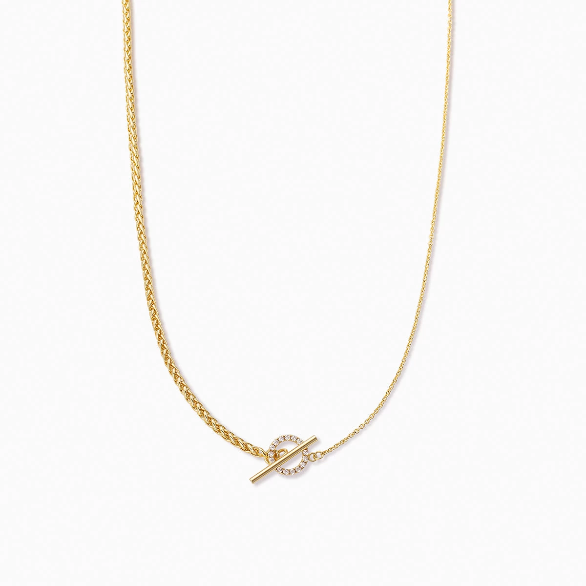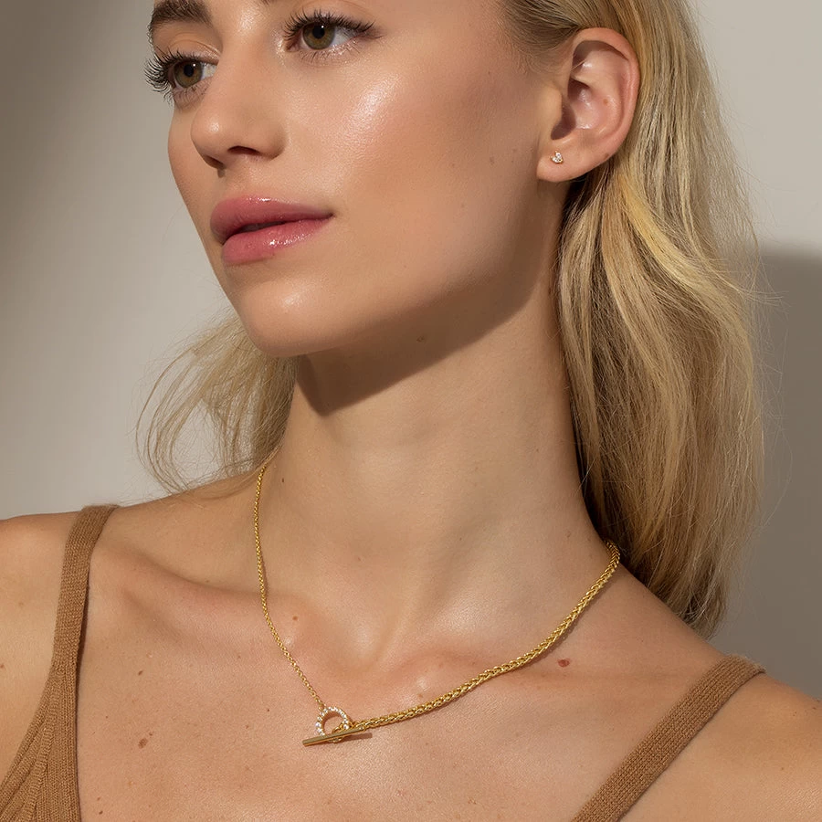 A dainty chain and a thick chain meet in the middle with a pavé circle closure and a large toggle bar to create our Turn It up Chain Necklace. This gold chain necklace is the perfect everyday style that can be layered with simple or bold necklaces — it’s all up to you.