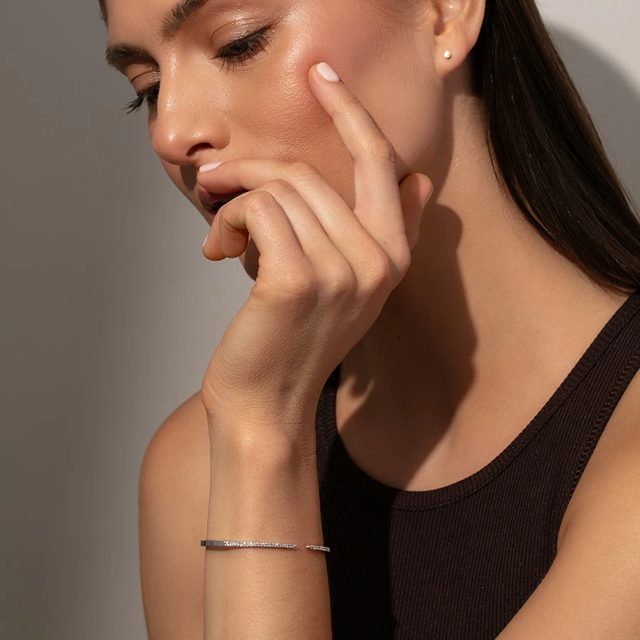 Take your arm candy to the next level with our Wild Nights Bracelet. This open cuff bracelet has a unique silhouette and a row of pavé at each end. For an extra sparkly look, layer this bangle bracelet with our Glam Tennis Bracelet.